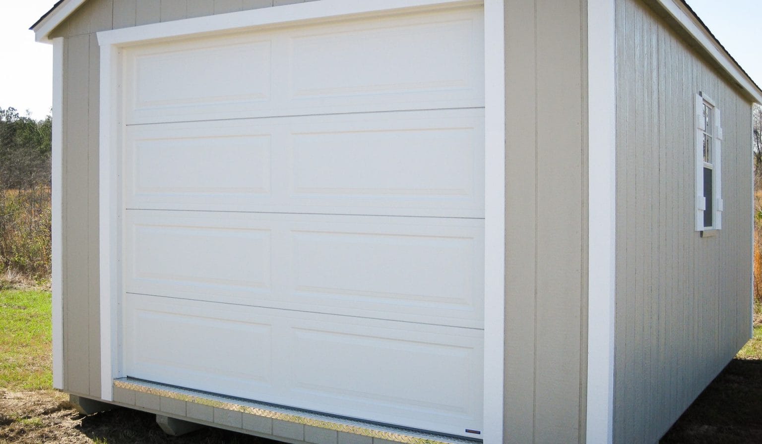Additionally, having a garage door built into the frame of your car shed will make the overall structure more durable. Both metal car sheds and prefab car sheds usually have built-in garage doors. On metal car sheds, the door usually closes onto the concrete foundation; on prefab car sheds, the door sill often features a built-in diamond-plate threshold.